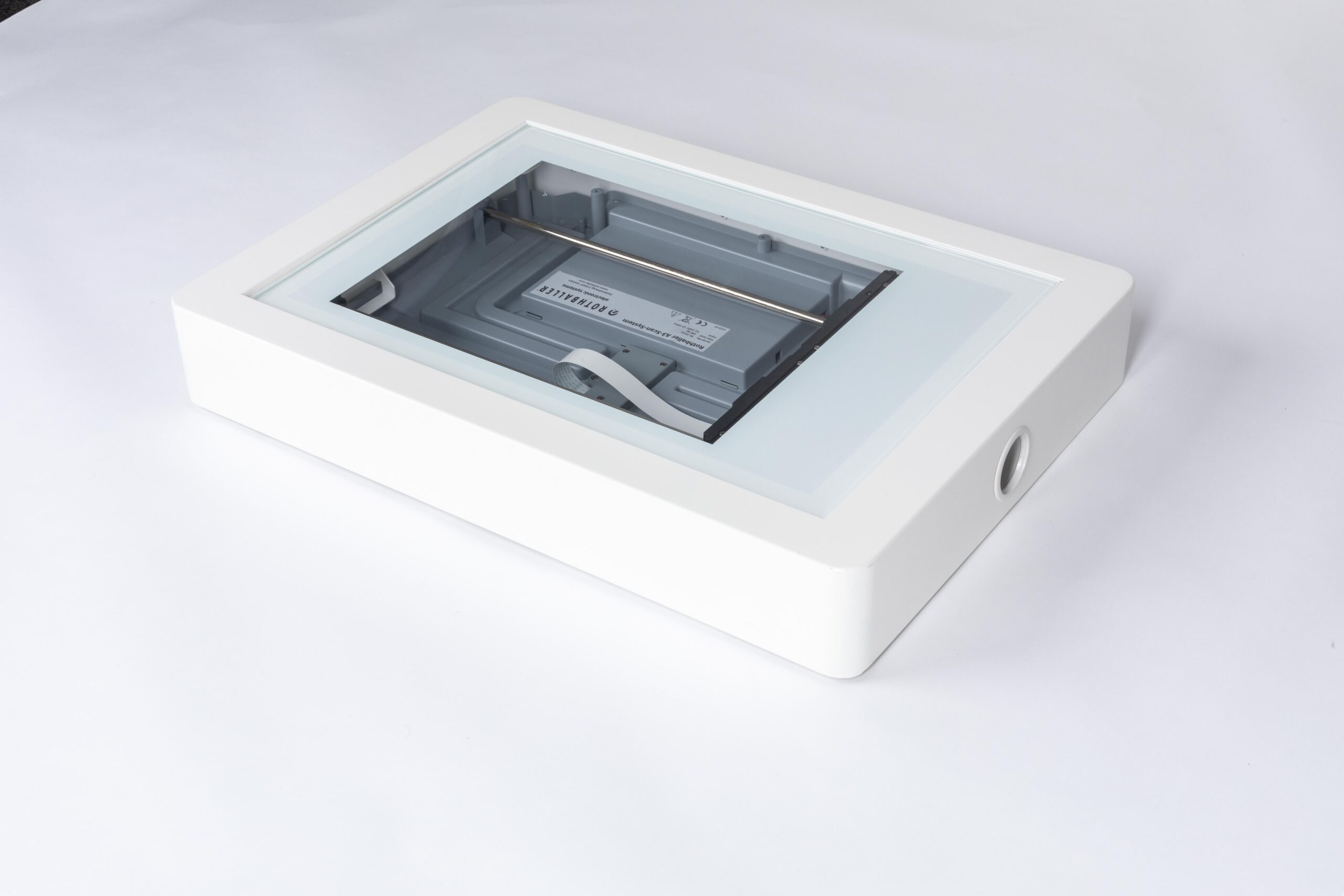 Die Deko-Schale für die 2D-Scanner Basic und HighSpeed deckt das Gehäuse des Fußscanners perfekt ab. Die Glasplatte bleibt dabei vollständig frei und der volle Funktionsumfang erhalten. Durch den integrierten Kabelauslass lassen sich alle Kabel ordentlich verlegen.